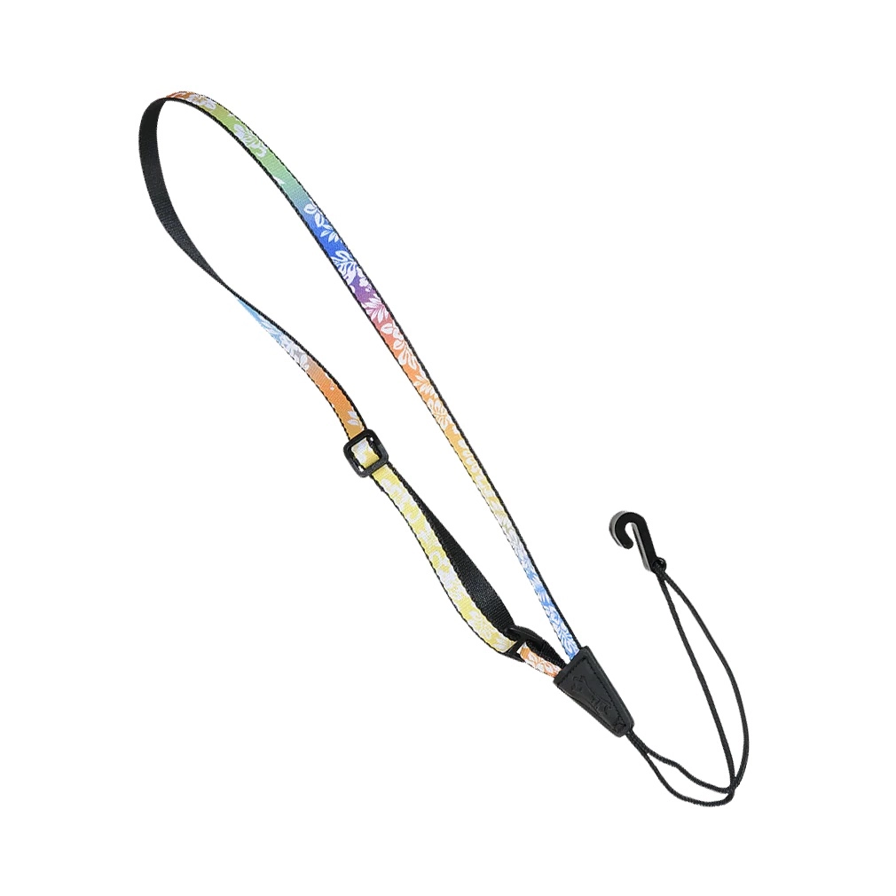 1/2" polyester ukulele strap sublimation-printed with Hawaiian design, with plastic sound-hole hook and tri-glide adjustment. Pictured in pattern 005. Also available in polyester patterns below. Adjustable to 26"'.