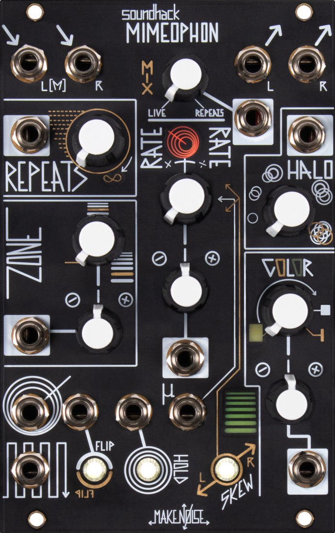 The Mimeophon music synthesizer module is a stereo, multi-zone color audio repeater by Make Noise and soundhack, coded by Tom Erbe.