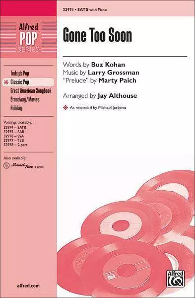 Michael Jackson originally recorded this beautiful, heartfelt song as a touching tribute to Ryan White, a young man who became infected with HIV from a contaminated blood treatment. A portion of the profits and royalties from the sale of this publication will be donated to the Elizabeth Glaser Pediatric AIDS Foundation. Song List:Gone Too Soon