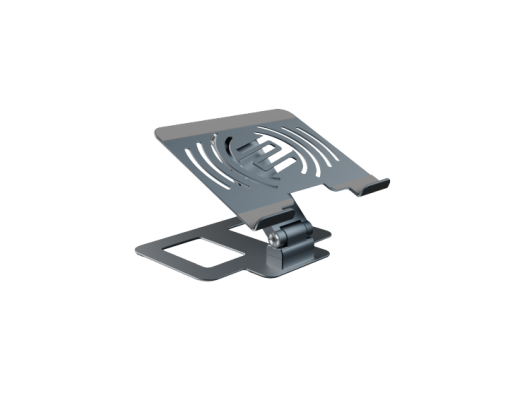 The laptop stand's ultra-thin, lightweight, yet durable aluminium construction combines maximum load capacity with space-saving and convenient features. The 360° rotating base allows for individual, ergonomic positioning in both C and Z positions. Infinitely adjustable to suit almost any work environment, it is held securely in place by recessed mounting screws. Non-slip pads under the base and rubber padding on the top protect laptops or tablets (sized 815 inches), and ensure a secure, reliable stand.