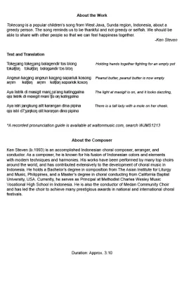 Tokecang is a popular children's song from West Java, Sunda region, Indonesia, about a greedy person. The song reminds us to be thankful and not greedy or selfish so that we can feel happiness together.