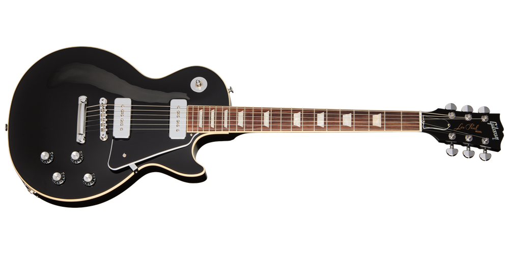 It also features accurate, smooth-turning Grover® Rotomatic® tuning machines with kidney buttons, as well as a chrome switch washer and output jack plate. The pickguard is a black five-ply style unit similar to those typically found on Les Paul Custom models. The electronics are also distinctive, featuring unique chrome-covered Gibson P-90 Soapbar pickups that are hand-wired to individual volume and tone controls, as well as a three-way pickup selector. The control knobs are black Top Hats with silver reflectors and dial pointers.