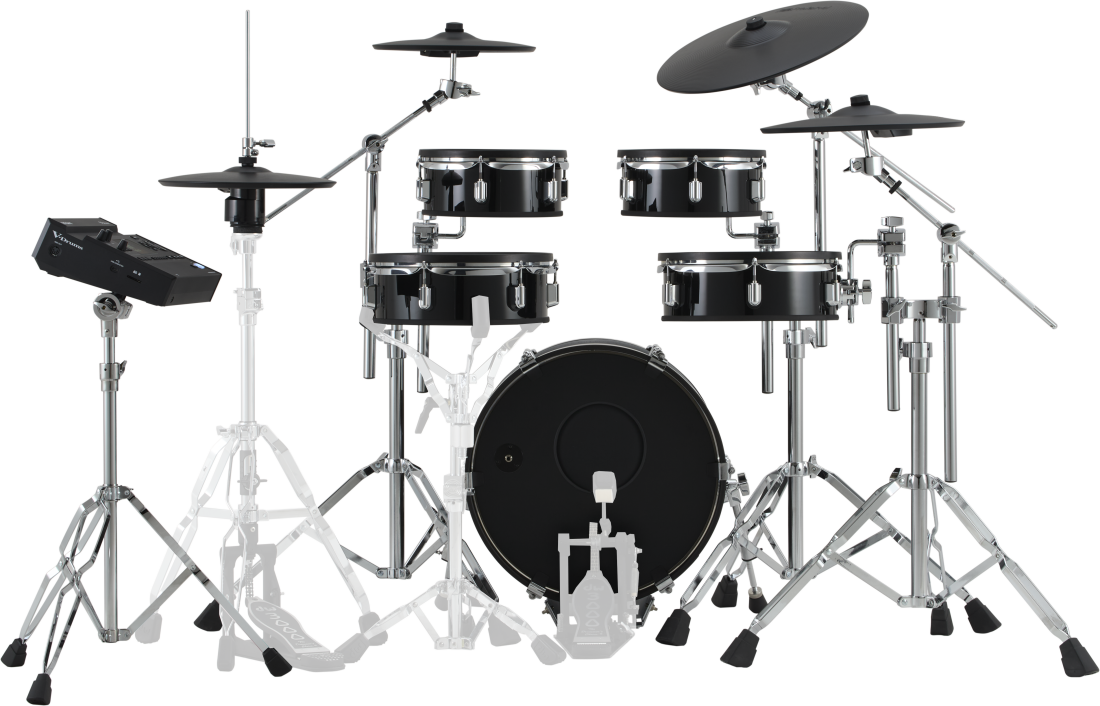 • Five-piece V-Drums Acoustic Design kit with shallow-depth wood shells and full-size kick drum• Expandable V31 sound module powered by the same advanced drum engine as the top-tier V71