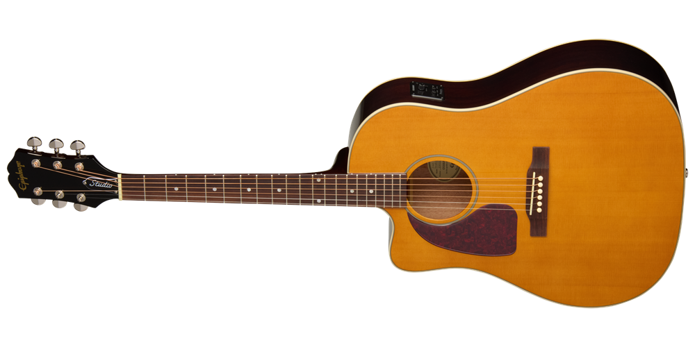 The Epiphone J-45 Studio has a gloss finish and is offered in two vintage-inspired colors-Natural and Vintage Sunburst. Both right and left-handed versions are available. A standard gig bag is also included.