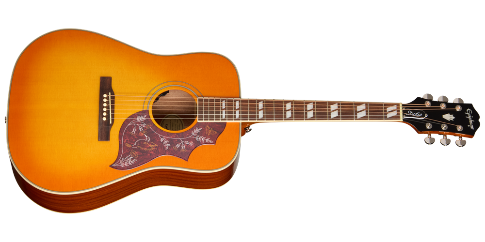 The Epiphone Hummingbird Studio has a gloss finish and is offered in two vintage-inspired colors-Antique Natural and Heritage Cherry Sunburst. Both right and left-handed versions are available. A standard gig bag is also included.