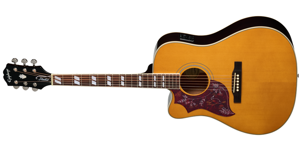 The Epiphone Hummingbird Studio has a gloss finish and is offered in two vintage-inspired colors-Antique Natural and Heritage Cherry Sunburst. Both right and left-handed versions are available. A standard gig bag is also included.