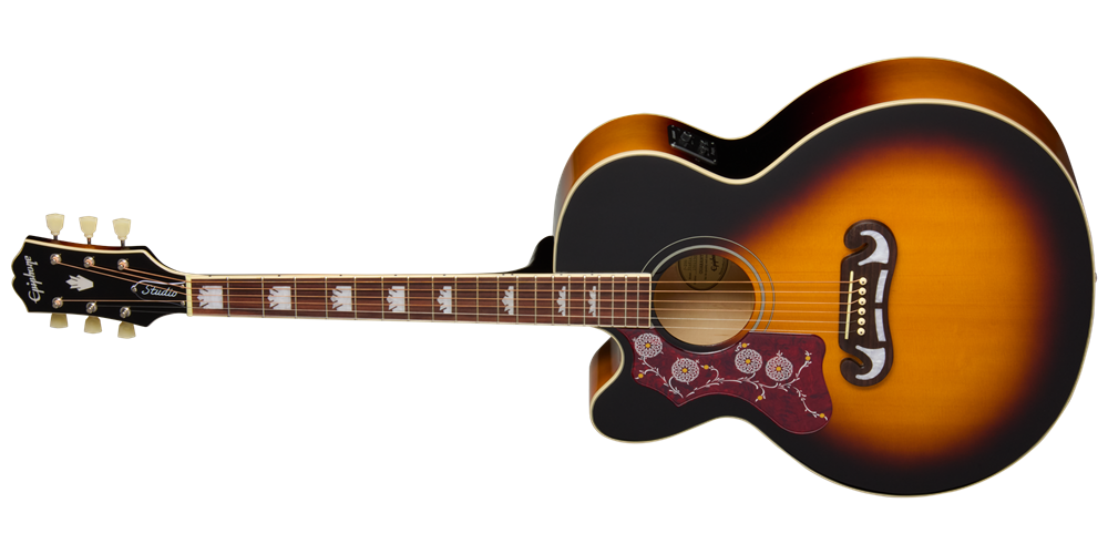 The Epiphone J-200 Studio has a gloss finish and is offered in two vintage-inspired colors-Natural and Vintage Sunburst. Both right and left-handed versions are available. A standard gig bag is also included.