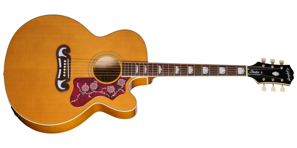 The Epiphone J-200 Studio has a gloss finish and is offered in two vintage-inspired colors-Natural and Vintage Sunburst. Both right and left-handed versions are available. A standard gig bag is also included.