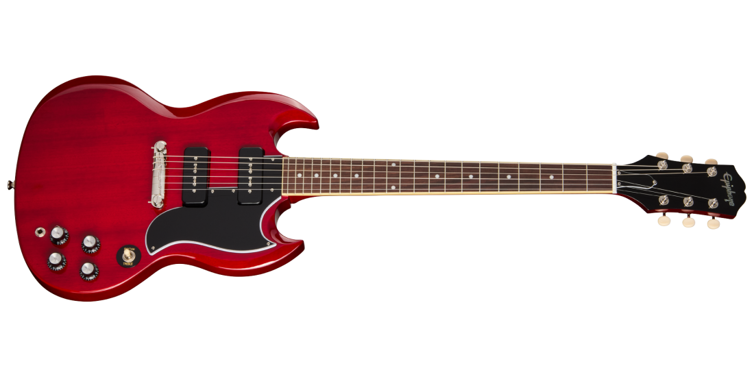 The Epiphone SG Special P-90 from the updated Inspired by Gibson Collection offers fans the legendary SG solidbody electric with a double-cutaway mahogany body, along with a mahogany neck that features a fast playing 60s SlimTaper profile. The neck is capped with a bound rosewood fretboard that is equipped with 22 medium jumbo frets and adorned with pearloid dot position marker inlays.