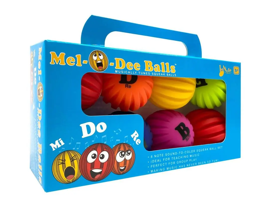 Set of 8 diatonic Mel-O-Dee Balls is accurately tuned and colour-coded by note so virtually anyone can play. Squeeze ball to produce an individual note and play together to play chords. Builds strength and dexterity while the textured surface provides sensory stimulation. Can be used by individuals of all physical or mental capabilities to develop coordination, creativity, and social skills. Each set comes with 6 songs to get you started. Packaged in colourful display box with handle for easy carrying.