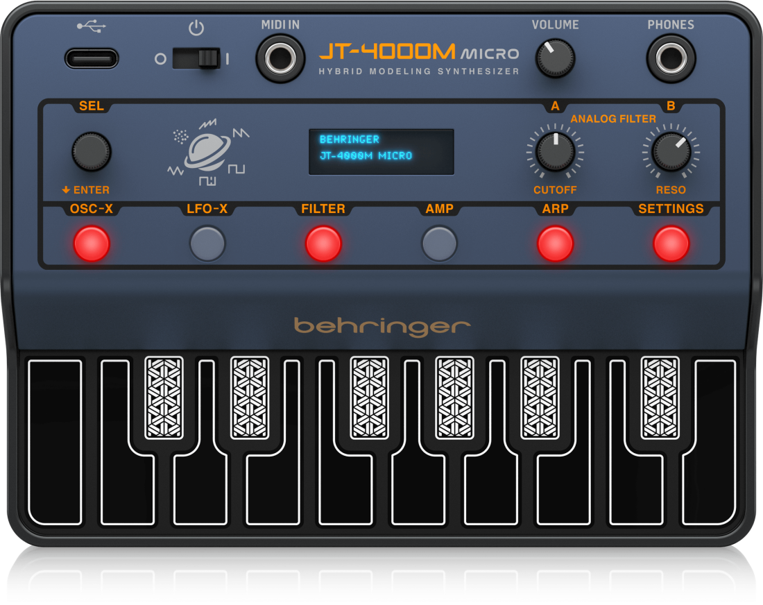 The JT-4000M MICRO is a reproduction of the JP-8k sound engine with a Supersaw waveform. But Behringer decided to go a bit further than that and hit it with a shrink ray, 32 memory presets, MIDI over USB, plus many more features that make it an amazing and flexible synth that can fit any setup.