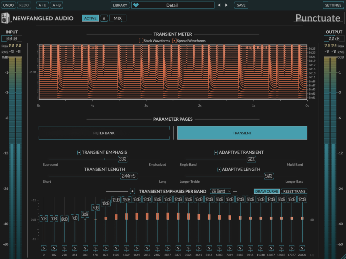 Punctuate uses these filters to break the incoming audio signal into the 26 critical bands, and runs a transient shaper on each band for unprecedented control over the transients of the audio signal. By doing this, Punctuate allows you to add punch in only the places where the signal needs, instead of just slamming the level of the entire signal up and down at the transient point. Because you have independent control over the bands, you can even emphasize transients in some bands while suppressing them in others. And because it's based on Critical Bands, it does this in such a way that sounds natural to the human ear, so you don't hear any artifacts. Finally, Punctuate allows you to smooth the transient modulation across bands using the ADAPTIVE TRANSIENT control. This allows you to run the bands independently for ultimate control, or couple them for a smoother sound.