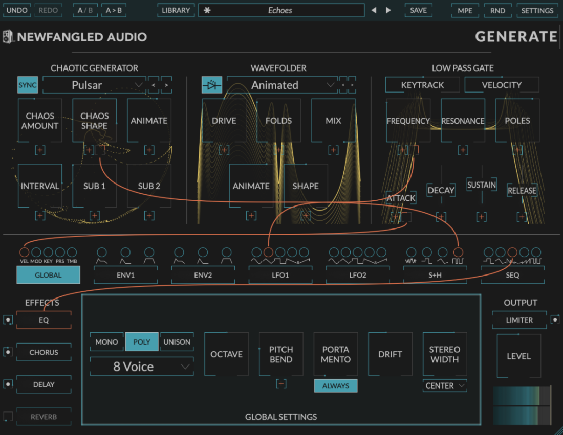 Generate's voice is followed by an unparalleled EQ, Chorus, Delay, Reverb, and Limiter, all to launch your chaotic sounds into outer space or right into your listeners' faces.