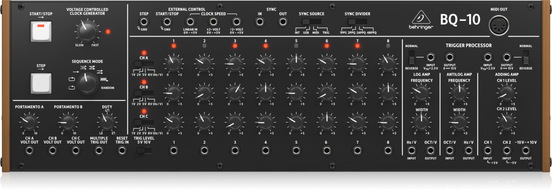 The BQ-10 is packed with features that make it both versatile and powerful. It can function as a single 16-step sequencer or split into dual 8-step sequences (Channels A and B) for added flexibility. Channel C is a separate 8-step channel where you can connect an external synth like the Behringer K-2 MKII via CV for controlling filter or amplitude. Each step features a voltage output knob as well as a dedicated trigger output allowing you to shorten sequences by connecting specific steps to the Reset input.