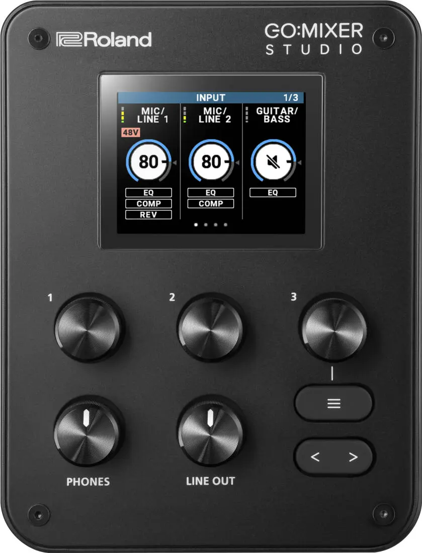 GO:MIXER STUDIO's clear color LCD lets users adjust inputs, outputs, effects, and mix balance directly on the unit, enabling standalone use as an audio mixer. Save and recall setups to speed up familiar sessions.