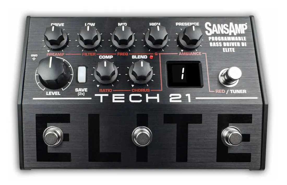 The SansAmp Programmable Bass Driver ELITE has two modes: Performance mode to have your 3 main presets at the ready and Studio mode for up to 128 locations for custom presets. Controls include Drive, Presence, Blend, Compressor, 3-band active EQ, and Level.