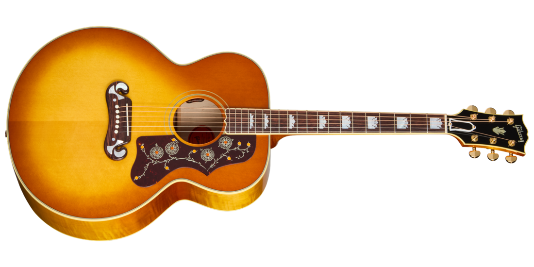 The SJ-200 60s Original features a AAA figured maple body, with a checkerboard marquetry strip down the center of the back, a solid AAA Sitka spruce top, and is presented in distinctive 60s-style nitrocellulose lacquer finishes. The two-piece maple neck has a walnut stringer and a comfortable Round profile, and a narrower 1.687 nut width as found on SJ-200 guitars from that era, which makes first-position chords easier to play. The rosewood fretboard is dressed up with classic mother-of-pearl graduated crown inlays, one of the visual hallmarks of the SJ-200, and is equipped with 20 standard frets. The no-border SJ-200 pickguard features the instantly-identifiable and iconic graphics, and the solid rosewood Moustache bridge is also adorned with mother-of-pearl hourglass and teardrop inlays.
