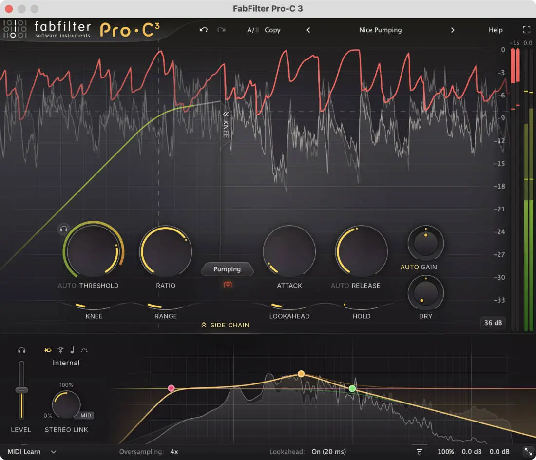 • Custom knee, variable from hard knee to a 72 dB soft knee (to enable saturation-like effects)