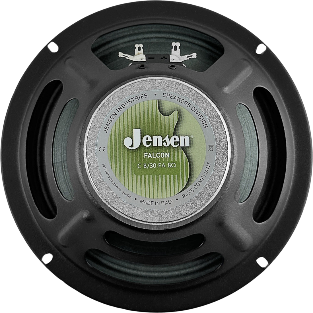 The Jensen Falcon line is characterized by the natural green cone membrane that delivers a "bigger than life" bass response and warm, full-bodied tone. The old-school building technique used, commonly referred to as a "seamed cone", increases the mass and the rigidity of the membrane, emphasizing the lower midrange and bass response. This method was quite common in vintage-style, small-size speakers in order to grant a fuller tone.