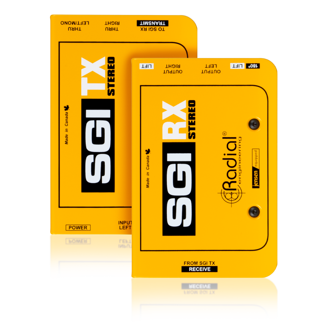 The SGI Stereo is an updated two-channel version of Radial Engineer's innovative SGI system. Featuring locking RJ45 Ethernet connectors (compatible with Neutrik etherCON locking connectors), the SGI Stereo allows a single Cat5 Ethernet cable to be used to connect the TX to the RX. This allows guitar players with stereo rigs to connect to dual amplifiers in a remote location, such as an amp room in a studio or when amplifiers are placed remotely on large stages. The system can also be used with a facility's existing Ethernet infrastructure, which is beneficial for home studios and any applications where rooms are wired with Ethernet cables but no analogue studio tie lines.