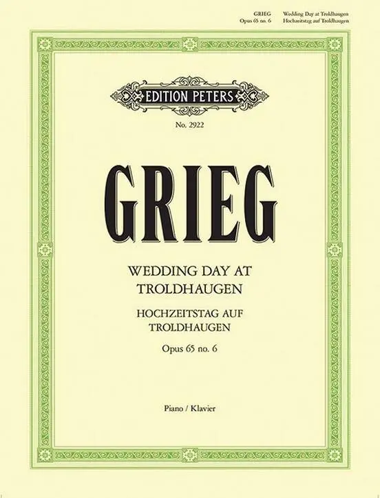 Wedding Day At Troldhaugen (Hochzeitstag Auf Troldhaugen) Op.65 No.6 from the set of Lyric Pieces is a delightful piece for Solo Piano by Norwegian composer Edvard Grieg. This piece demonstrates such range ofcharacter and feeling, with dramatic contrasts in tempo and dynamics. Grieg uses beautiful harmonic shadings, using harmonies traditional to Norwegian folk music - from which he was greatly influenced.
