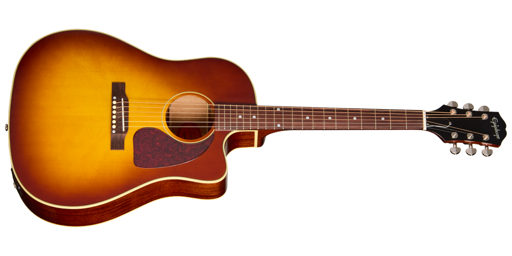 The J-45 Standard EC features a round shoulder cutaway body with a back and sides made from solid mahogany. The mahogany body is paired with a solid spruce top for the classic tonewood recipe that is at the heart of the J-45 design. Since it is made from solid tonewoods, the sound of this guitar will only improve as it ages. The one-piece mahogany neck is glued to the body and attaches with a tapered dovetail joint. The neck has a comfortable Rounded C profile and is topped with a rosewood fretboard with 20 standard frets and mother-of-pearl dot inlays. The headstock features the popular 60s Kalamazoo shape, and is equipped with precise and smooth-turning Grover® Rotomatic® tuners and a bone nut, and is adorned with the Epiphone logo inlaid in mother-of-pearl.