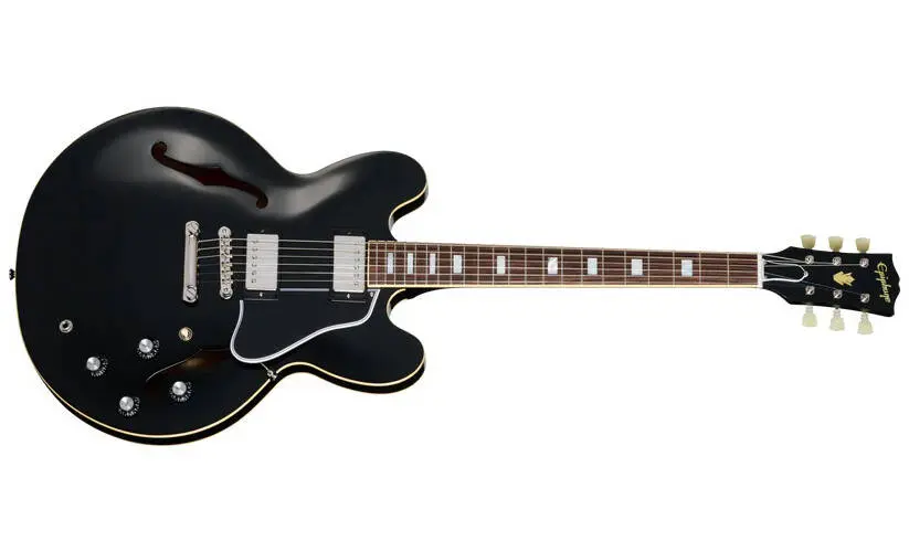 The Epiphone 1962 ES-335 Reissue has a semi-hollow 5-ply layered maple/poplar body with rounded cutaways and a solid maple centerblock for outstanding sustain and feedback resistance. The genuine one-piece mahogany neck has a thin 1960s SlimTaper™ C profile and is capped with a rosewood fretboard that is outfitted with 22 medium jumbo frets and mother-of-pearl small block inlays. The fretboard features rounded edges to give it a comfortable, played-in feel that invites you to explore it for hours at a time. Even the side dot position markers are the same size as on vintage 1962 ES-335 models and are placed in historically accurate locations. The Gibson-style "open book" headstock features the Epiphone logo and Gibson Crown inlaid in aged mother-of-pearl and is fitted with smooth-turning Epiphone Deluxe tuning machines with Double Ring Keystone-style buttons and a Graph Tech® nut.