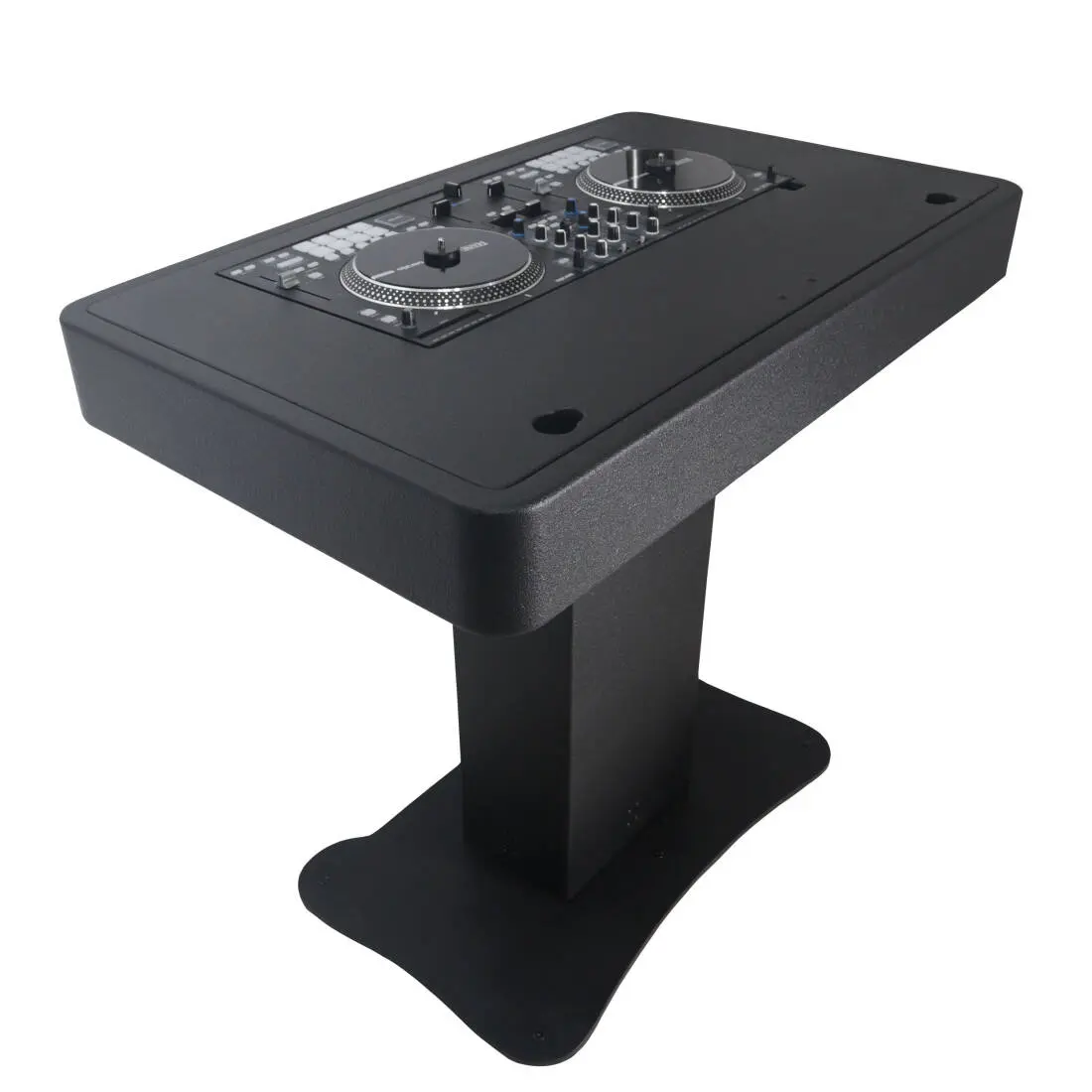 The T-shaped DJ Controller podium is manufactured in Poland and made from the highest quality materials in Europe. Top-quality birch plywood finished with white warnex textured paint. The inside of the control deck is lined with high-density foam that stabilizes and secures your controller firmly into the control deck. Place your laptop on the secure tray attached to the included boom arm that can tilt, swivel, rotate, raise, and lower to your desired position. The podium center is equipped with three-tier shelves (for utility storage, mics, cables, etc). There are pre-drilled holes in each shelf to allow power and audio cables to pass through from the controller down to the base area.