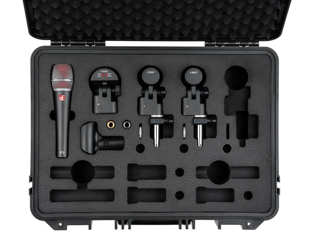 The V Pack VENUE consists of one V KICK for your bass drum, two V BEATs and V CLAMPS for your toms, and one V7 X for your snare. All mics and accessories come securely packaged inside a robust and distinctive plastic flight case, with lots of space included to let you customize your drum microphone setup.