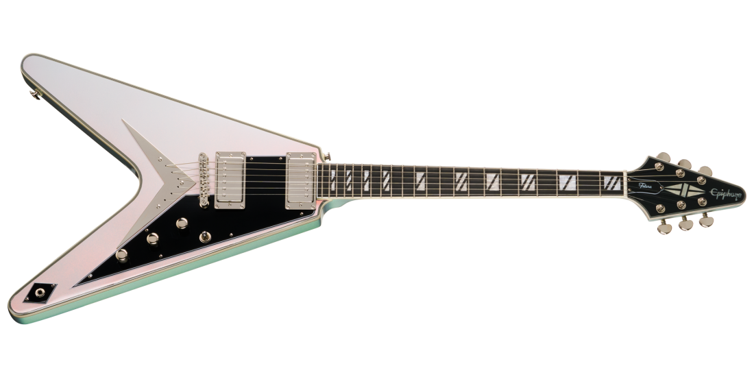 At the heart of the Futura Flying V Custom are Epiphone's new ProBucker™ Ignite humbuckers™, delivering powerful tones with clarity and definition. Two push/pull volume controls enable coil-splitting, while a push/pull tone control adds phase switching for even greater sonic flexibility. Available in two stunning Chromashift finishes-Quicksilver Shift and Solaris Shift-this guitar is designed to turn heads on stage or on screen. Whether you're after a modern aesthetic, versatile electronics, or a performance-ready instrument at an accessible price, the Futura Flying V Custom delivers. Each one ships with a premium gig bag, ready to accompany you wherever inspiration strikes.