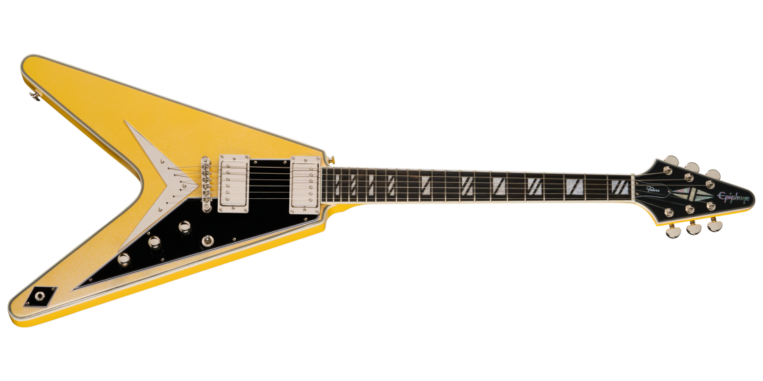 The Gibson Flying V™ remains one of the most iconic and adventurous designs in electric guitar history. First introduced in the late 1950s, its futuristic shape was ahead of its time, eventually becoming a favorite among rock and metal players worldwide. Epiphone proudly introduces the Futura Flying V Custom-a striking, modern interpretation of that groundbreaking design. Its angular mahogany body features elegant 7-ply top binding, paired with a LockTone™ Tune-O-Matic™ bridge and LockTone Stop Bar tailpiece for exceptional sustain and tuning stability. Posi-Lok™ strap buttons keep your strap secure without extra hardware. The glued-in mahogany neck sports a sleek Modern C profile for effortless playability, topped with a bound ebony fingerboard featuring 22 stainless steel medium jumbo frets and sophisticated Super 400-style pearloid split block inlays. A 10"-14" compound radius ensures smooth chording and bends, while the bound arrowhead-shaped headstock includes locking Grover® Rotomatic® tuners with kidney buttons, a Graph Tech® nut, and elegant mother-of-pearl inlays for the Custom split diamond and Epiphone logo.