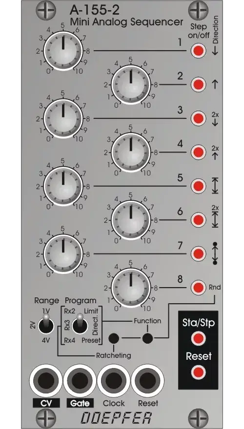 Module A-155-2 is a small, very compact designed analog sequencer with a lot of features. The sequence length is 8 steps. Each step has available a control for the adjustment of the control voltage for this step and an illuminated momentary switch (button). The buttons are used in the standard running mode to turn on/off the gate of the step in question (button illuminated = gate on, not illuminated = gate off). In combination with other controls at the bottom of the front panel the buttons are used for additional functions: depending on the position of the Program toggle switch the button Function is used to program the length of the sequence (switch position Limit), the running direction (switch position Direct.) or to call up the preset management (switch position Preset).