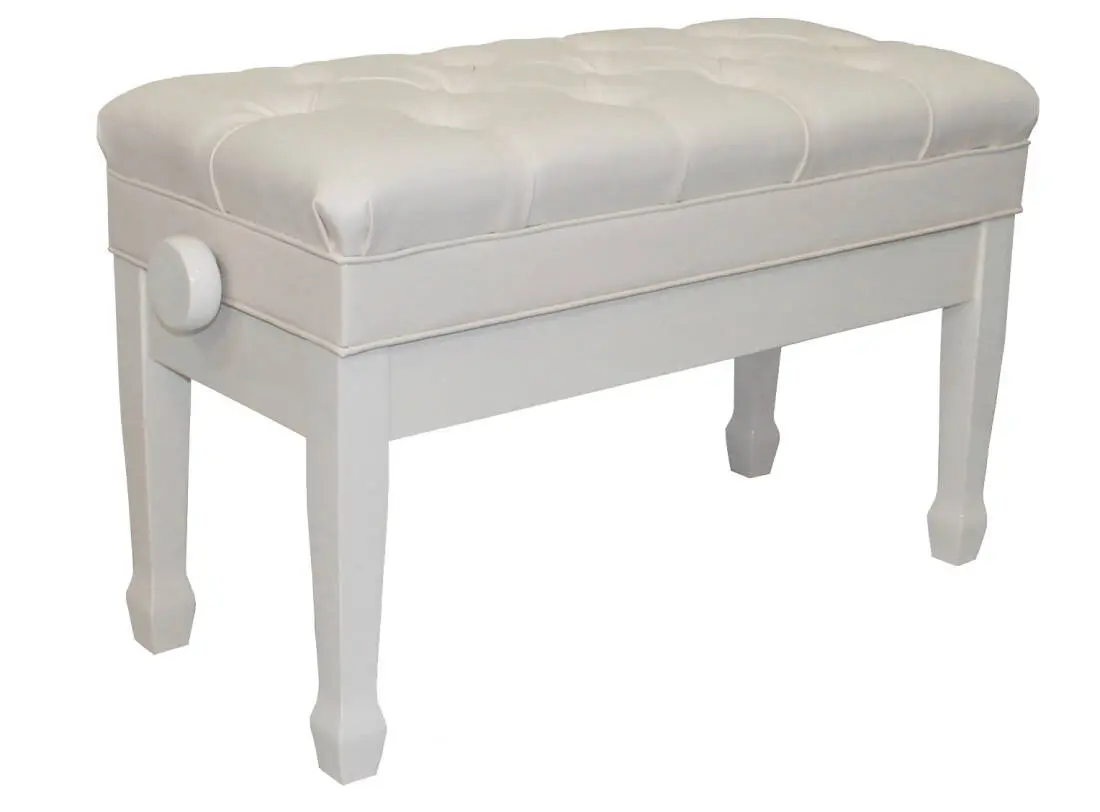 Piano Bench Model "MAESTRO 1G PWHITE" is a wooden piano bench made by Benchworld. Duet 30" Long, 14" Wide, with storage (about 1.5" Deep), finished in a polished white colour. The seat is covered with premium bonded leather with deep diamond tufted buttons. The foam is designed to be comfortable - not super hard and not very soft. Since the buttons are deep tufted you don't feel them when you sit on the bench. All sides and legs are solid wood (birch) imported from Europe.