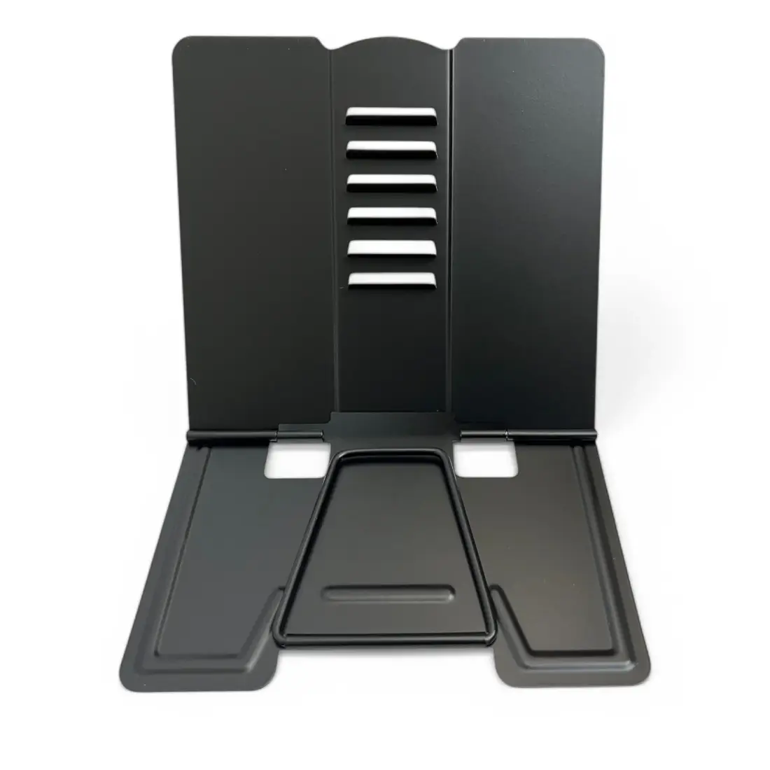 Highly versatile and very sturdy. Holds all-size books securely. Folds for convenient storage. Strong steel construction. Adjustable to six different viewing levels.
