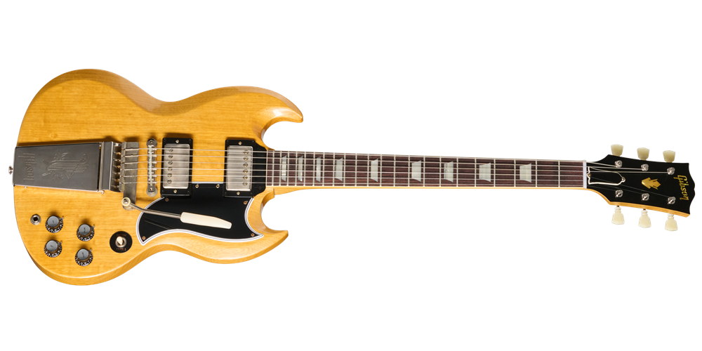 Period-correct hardware completes the instrument, including an ABR 1 Tune O Matic™ bridge, nickel pickup covers, black plastics, Kluson® Deluxe tuners, and the distinctive Maestro™ Vibrola™ tailpiece. Each detail contributes to the unmistakable look and feel of a mid 60s SG, honoring the past while embracing a refreshed tonal identity driven by its unique Korina construction.