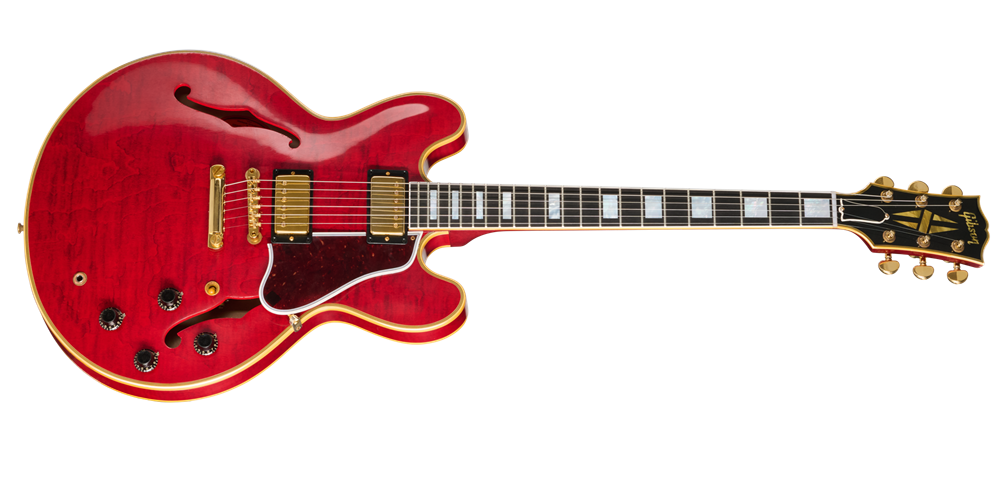 Gold hardware, an ABR 1 Tune O Matic™ bridge, a Stop Bar tailpiece, Grover® Rotomatic® tuners, black plastics, and black Top Hat knobs complete the period-correct aesthetic. The multi-ply bound headstock features the Gibson logo and a Custom split diamond inlaid in mother of pearl, underscoring its status as the top-of-the-line ES model from Gibson Custom. Every guitar includes a Certificate of Authenticity and a Lifton™ reissue hardshell case.