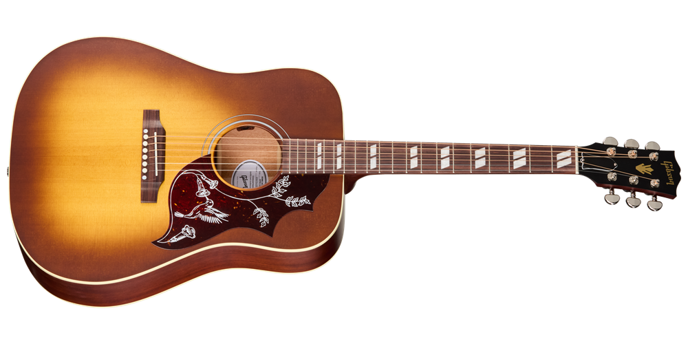 The neck has a comfortable Round profile, and the rosewood fretboard has a 12" radius and features pearloid parallelogram inlays, which is one of the visual hallmarks that makes the Hummingbird easily recognizable. The fretboard is fitted with 20 standard frets. The traditional belly-up rosewood bridge is equipped with a TUSQ® saddle, and the nut and bridge pins are also TUSQ. High-quality Grover® Rotomatic® tuners ensure rock-solid tuning stability. The pickguard features a simplified version of the world-famous Hummingbird pickguard graphics.