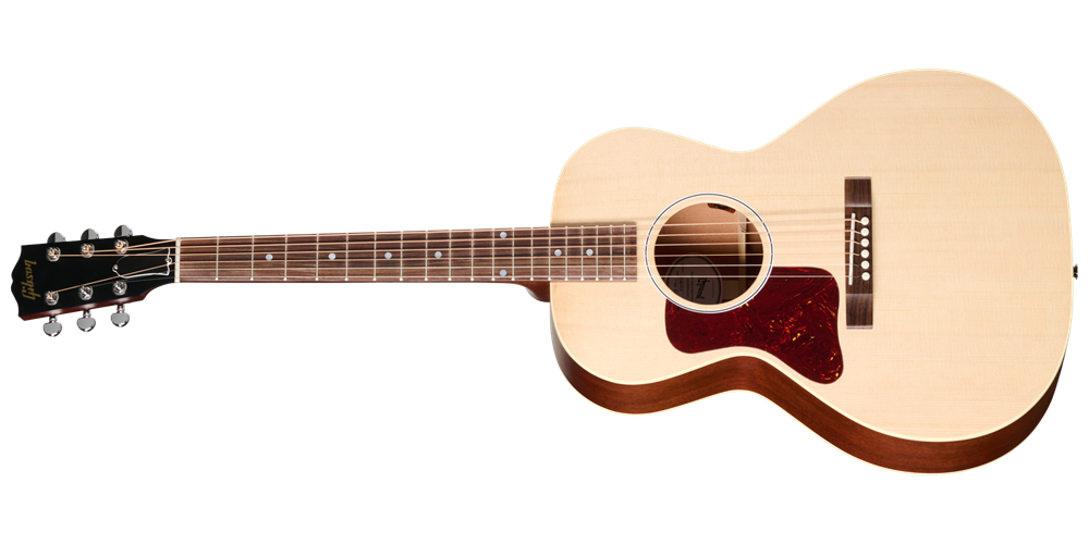 Both the top and back feature single-ply binding around the perimeter. The narrower waist of an L-00 body shape provides a focused and nuanced sound, naturally giving it a leaner and tighter bass response that sits perfectly in the mix. The tone is ideal for fingerstyle playing and blues and works very well for other genres and playing styles, too. The utile neck is attached to the body with a compound dovetail neck-to-body joint, and like all Gibson acoustic guitars, it is affixed with hot hide glue. The neck has a comfortable and fast-playing SlimTaper™ profile, and the rosewood fretboard has a 12" radius and is adorned with simple mother-of-pearl dot inlays and is fitted with 19 standard frets. The closed slot rectangular rosewood bridge is equipped with a TUSQ® saddle, and the nut and bridge pins are also TUSQ. Smooth turning Grover® Mini Rotomatic® tuners ensure solid tuning stability.