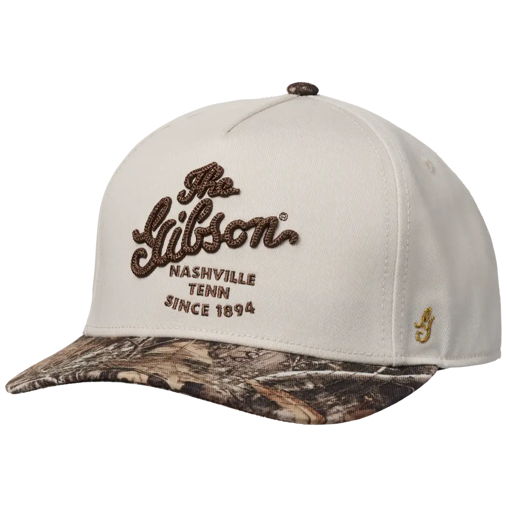 Available in Beige, Black, Olive, and Camo, this structured snapback features the 1930s Gibson script logo embroidered on the front.