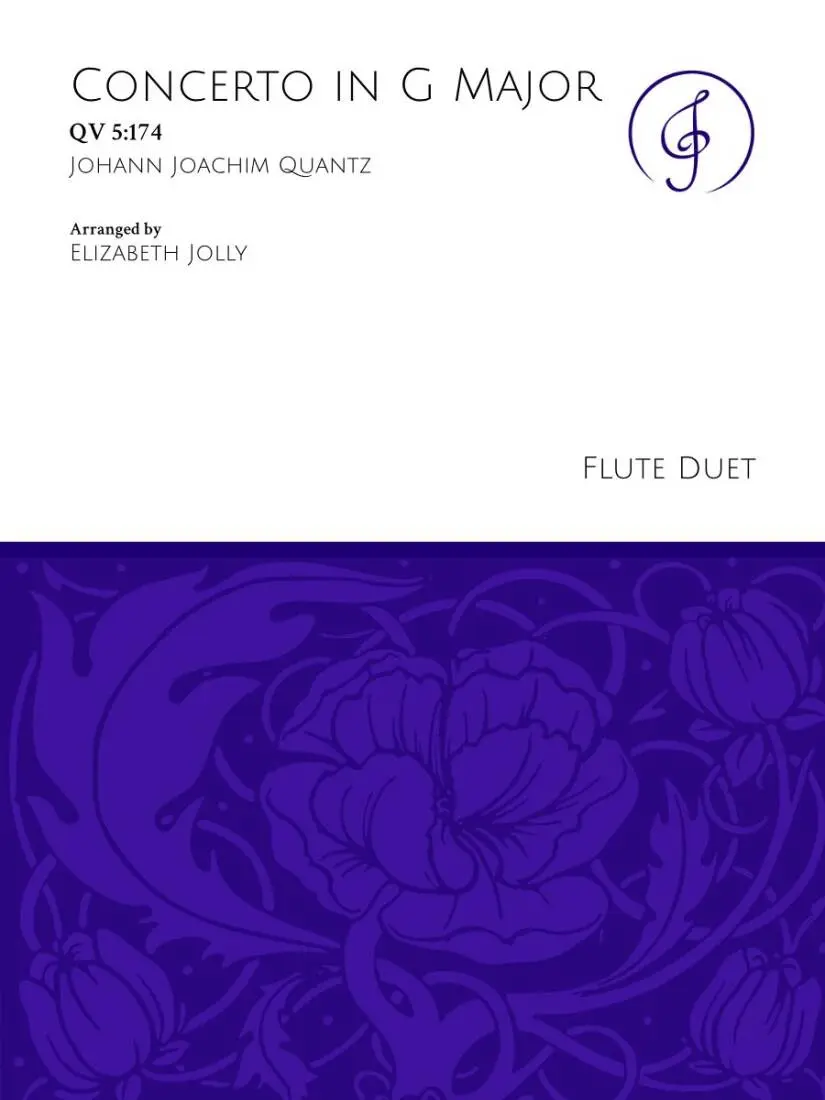 Johann Joachim Quantz (1697-1743) was one of the most influential flutists and composers of the 18th century, admired for his prolific output and deep understanding of the flute as both performer and instrument maker. As flute teacher and court composer to Frederick the Great of Prussia, he composed over 300 concertos, 200 sonatas, and numerous other works for the instrument. The Concerto in G Major, QV 5:174 exemplifies Quantz's elegant galant style. The opening Allegro is lively and melodic, followed by a song-like Arioso that highlights the flute's vocal quality. The concluding Presto is bright and virtuosic, closing the work with energy and flair. This duet arrangement retains the original solo part and adapts the orchestral accompaniment for a second flutist, ideal for teachers playing with students. Optional material in the solo part during orchestral tuttis allows for a fuller, more collaborative performance or may be omitted for a traditional concerto interpretation.
