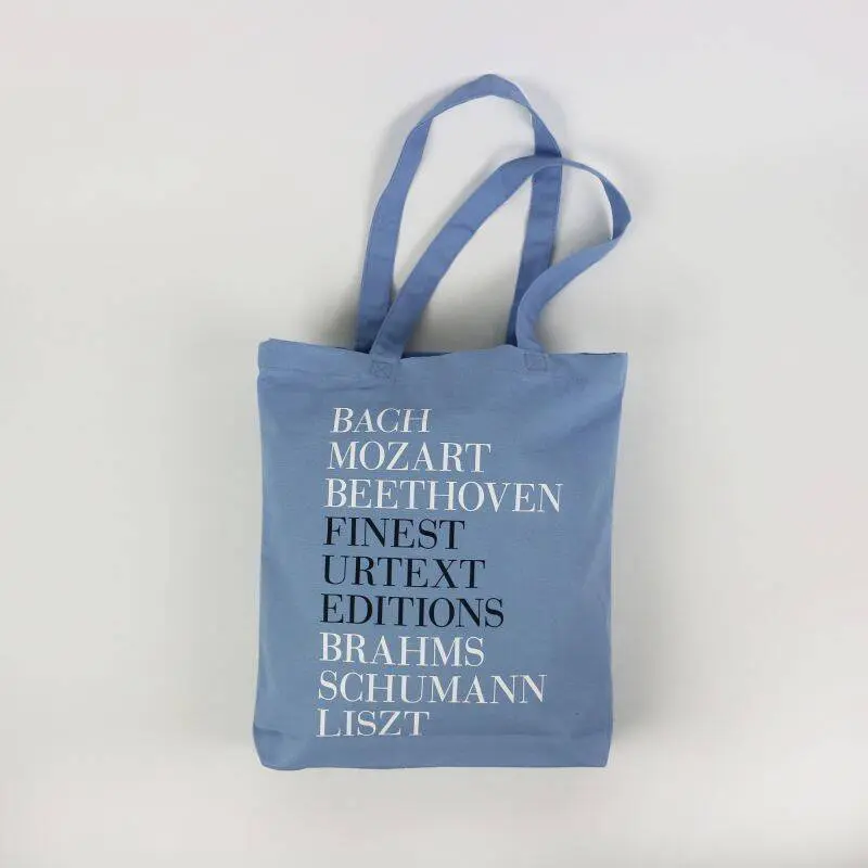 Tote bag made of light blue Panama fabric in Henle design. The non-slip structure of the material allows you to feel the weave and is particularly hard-wearing and tear-resistant. The bag is printed on one side with the well-known Henle logo and on the other with the names of famous composers and the slogan 'Finest Urtext Editions' in blue and black colour and typical lettering.