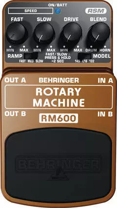 The RM600 ROTARY MACHINE box features dedicated rotary controls Slow and Fast rotation speed, Drive (to squeeze the last drop of dynamics out of your tone) and Drum/horn blend. 2 slide switches let you choose 3 ramp speeds and 3 classic rotary speaker sounds. And the featured Real Sound Modeling (RSM) DSP turns out stunning realism that will have your audience looking for those old funky spinning speakers that used to be the only way to create this sound. The tough metal footswitch maintains straight-wire signal integrity in bypass mode. A clear blue LED indicates power status and battery condition. The RM600 pedal runs on both our BEHRINGER PSU-SB DC power supply and a typical 9 V battery for maximum flexibility.