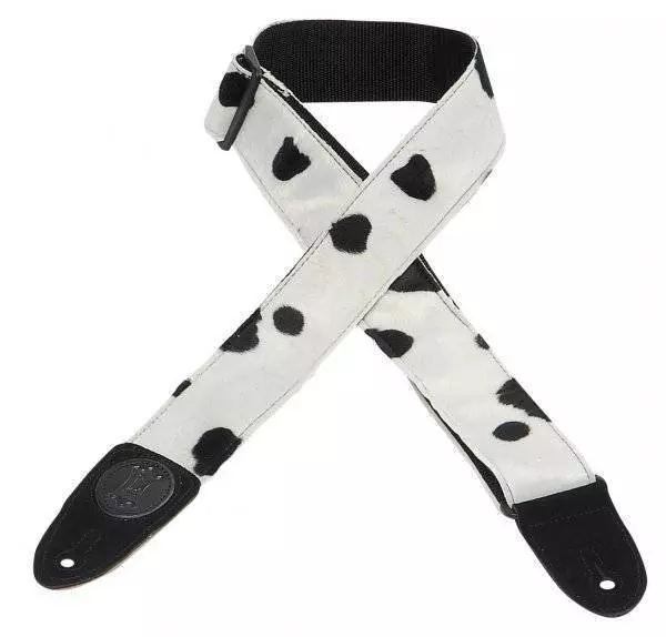Sangle de guitare de 2 po en fausse fourrure avec endos en sangle de polypropylène, extrémités en cuir et réglage à trois patins. Réglable jusqu'à 54 po