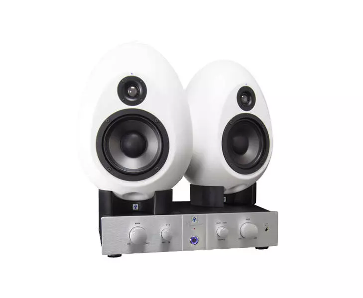 The EGG150 Monitoring System features a pair of analogue EGG speakers with a custom-designed amplifier control unit. Electronics are housed inside the amp, rather than inside the EGGs themselves. Each EGG is made with a rigid and resonant-neutral monocoque shell and equipped with a 150mm LF driver and a 25mm HF tweeter.