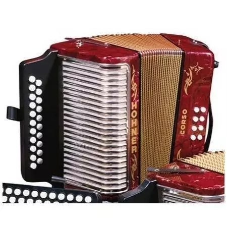 Finely machined reeds, valves, bellows, precision mechanics buttons, wood and metal - out of this complexity of parts comes the Hohner diatonic accordion. A versatile and portable instrument, the distinctive Hohner sound is revered by the world's top musicians. Hohner's Corso has a three-voice tremolo and a four-voice bass with one shoulder strap. The Corso is well suited to playing folk, polka and traditional music. Ideal for Folk, Polka, and Traditional Accordion playing.