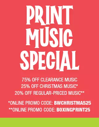 Clearance Music - 75% off  •  Christmas Music - 25% off (online using promo code: BWCHRISTMAS25)  •  In-stock Print Music - 20% off* (online using promo code: BOXINGPRINT25)