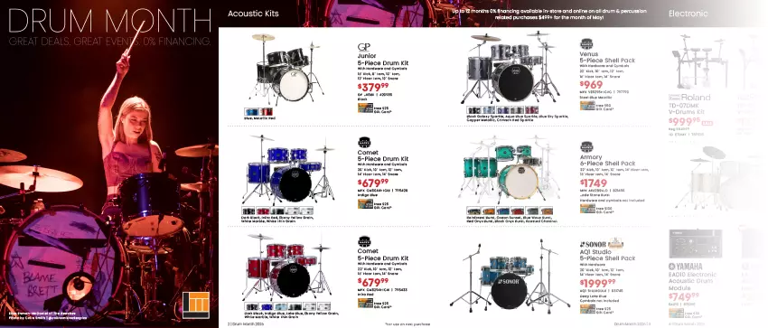 • Up to 12 months 0% financing available in-store and online on all drum & percussion related purchases $499+ for the month of May!