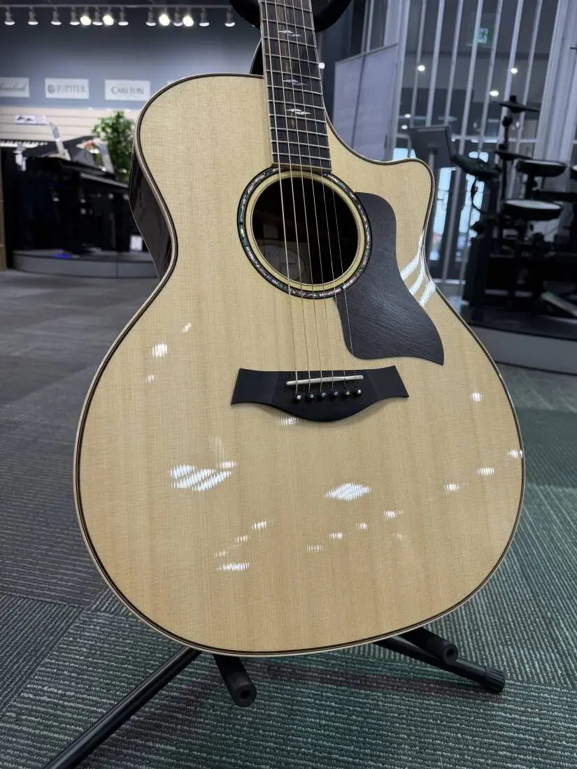 Taylor's popular 814ce offers players the ultimate all-purpose guitar. Its balance, warmth and articulation are great for fingerstyle, it has enough punch as a strummer to front a band, and the top-end power will fuel lead runs without getting shrill. Its a great choice for a gigging player looking for one guitar that can cover it all. The revoicing of the 800 Series has brought greater warmth, a more mature midrange, and a looser, more luxurious low end to the 814ce, thanks in part to the customized bracing and a new, custom-calibrated Elixir HD Light string-gauge set. Premium appointments include maple binding and back strip, rosewood top edge trim, a rosewood pickguard, Taylors new Element fretboard inlay in mother-of-pearl, a marbled fretboard, and new Expression System 2 acoustic electronics. The guitar features a Venetian cutaway and includes a Taylor deluxe hardshell case.