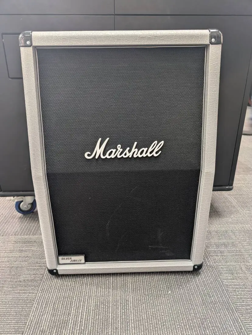 The 2536A speaker cabinet features classic Jubilee styling: silver vinyl covering with Marshall script logo, name plaque and side-grip carrying handles for easier transportation.