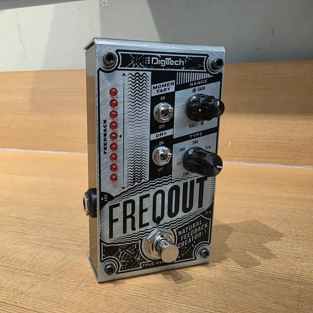 The DigiTech FreqOut Natural Feedback Creator allows you to get sweet, natural feedback at any volume, with or without distortion. The FreqOut is perfect for situations where volume must be controlled like in the studio, with in ear monitors, or low-volume performance and practice. However, the FreqOut can also be used at gig volume to focus out-of-control feedback on a preferred harmonic at any stage position.